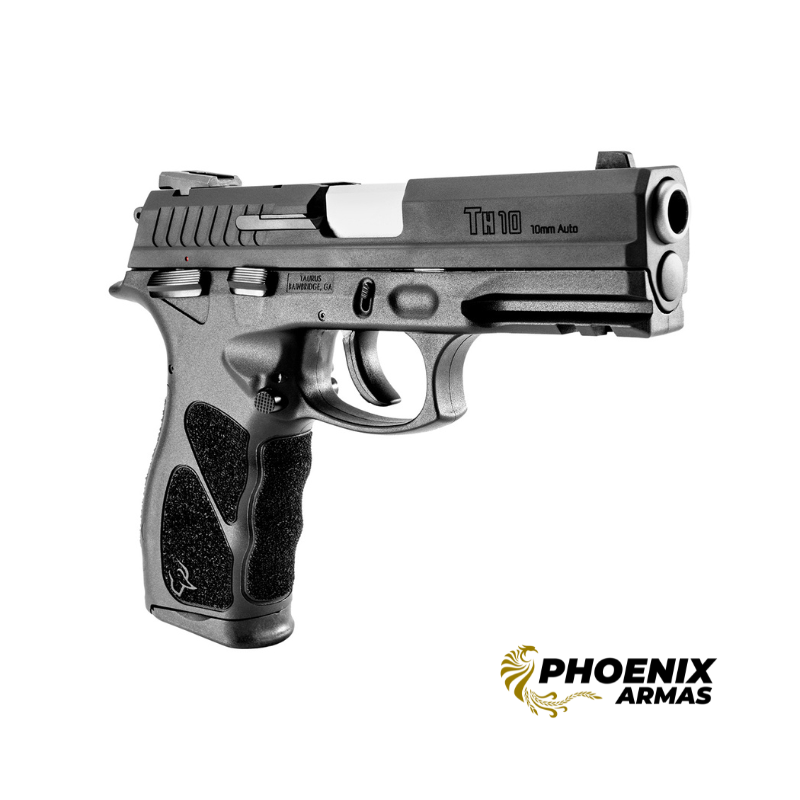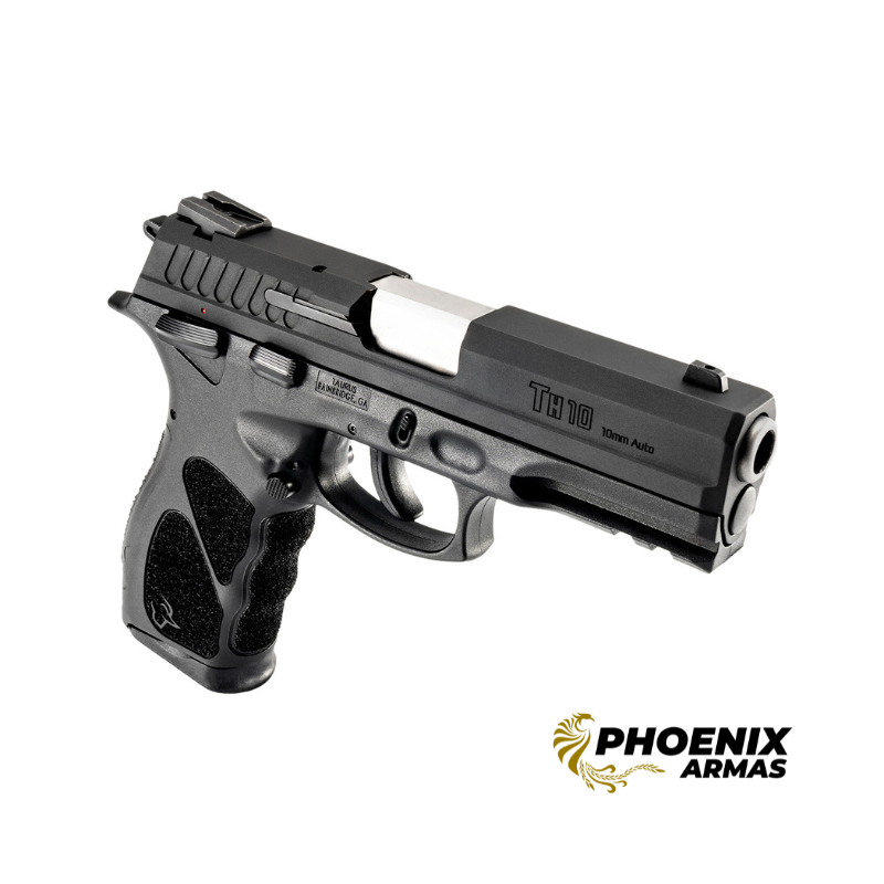 A TH10 Taurus no potente calibre 10mm e ação simples e dupla (SA/DA), atende a uma demanda recorrente dos consumidores da marca. Sendo 100% ambidestra, é confeccionada com a armação em polímero de alta resistência da consagrada série TH, contribuindo para a melhor empunhadura do atirador, e tem acabamentoem Carbono TENOX. Possui cano de 4,25″, peso de 825 gramas e capacidade de 15+1 disparos. Possui backstraps intercambiáveis, que permitem ajustar o tamanho daempunhadura para se adequar perfeitamente à mão do atirador, e trilho Picatinny MIL-STD-1913 para montagem de acessórios. A Pistola TH10 conta também com dispositivos de segurança como o indicador demunição na câmara, a trava de percussor, além da trava manual e do desarmador do cão ambidestros. É uma arma indicada para defesa pessoal e para utilização como backup para caça.