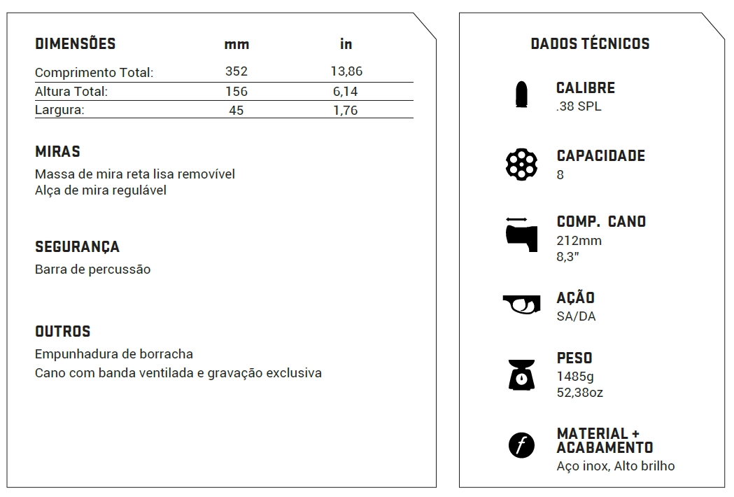 Em calibre .38 SPL e capacidade para 8 disparos, este revólver combina eficiência balística com um design robusto, funcional e imponente, inspirado em consagrados modelos de grande porte da Taurus. Construído em aço inoxidável com acabamento em alto brilho, o 838 Alligator une presença, durabilidade e resistência à corrosão.